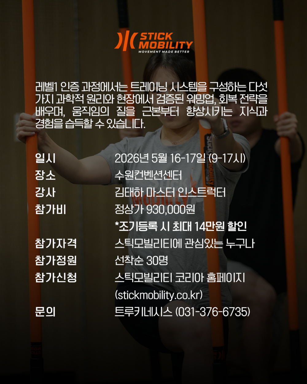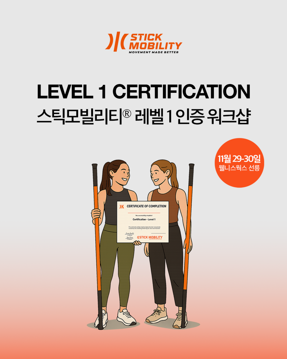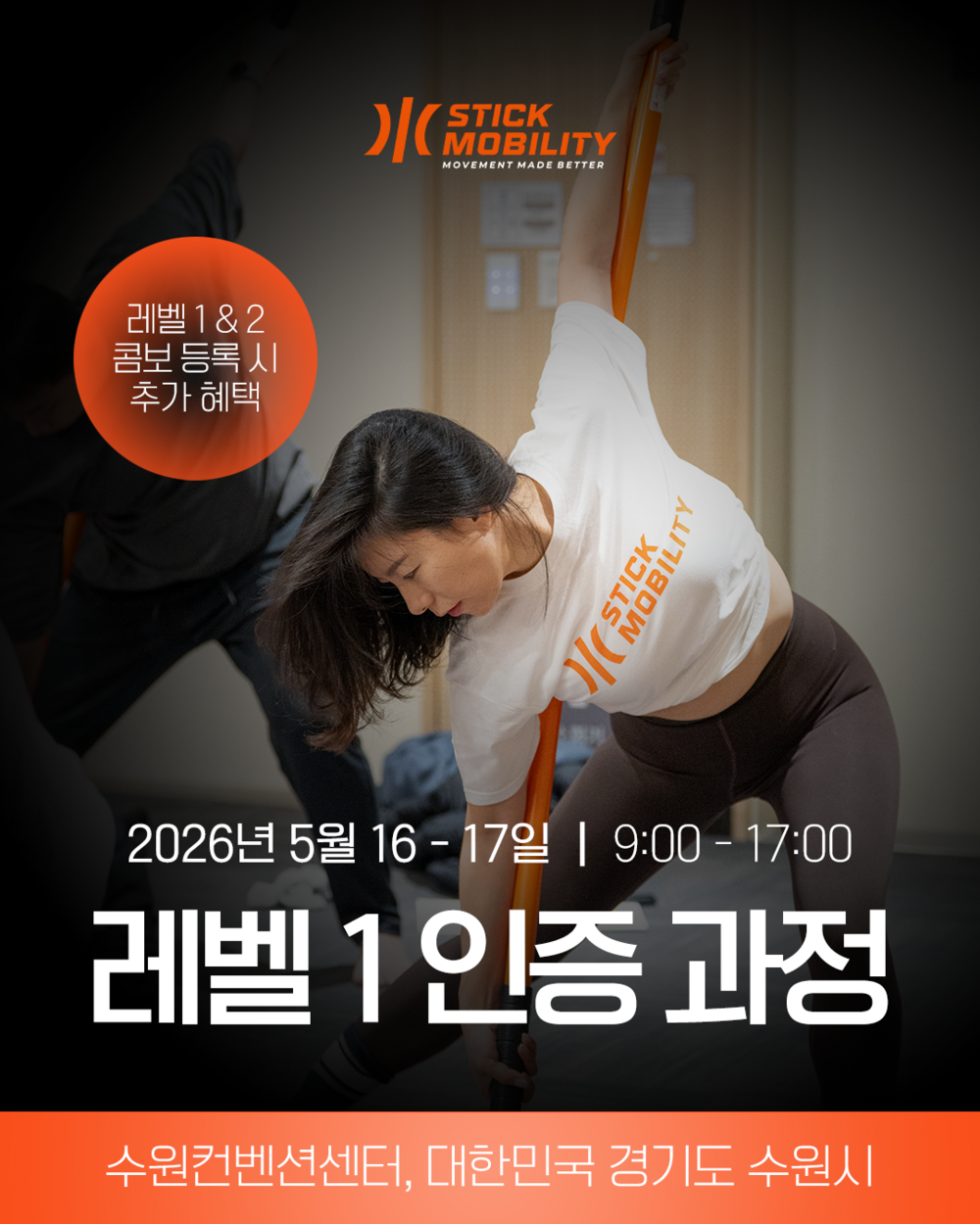레벨 1 인증 워크샵은 이틀 동안 진행되는 대면 교육 과정으로 유연성, 근력, 그리고 협응력을 향상시키는 스틱모빌리티 훈련 방법을 배우는 과정입니다.