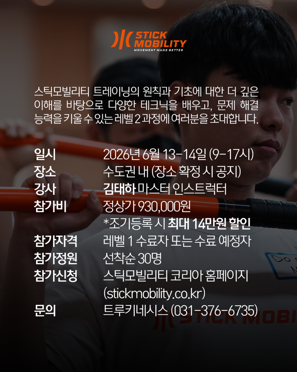 2024년 3월 이후, 2년 만의 레벨 2 인증 과정이 2026년 6월 13-14일 개최됩니다. 레벨 2 인증 과정을 통해 스틱모빌리티 훈련 테크닉을 심화하고, 문제 해결 능력을 키워 더 높은 수준의 전문가로 발돋움하세요.